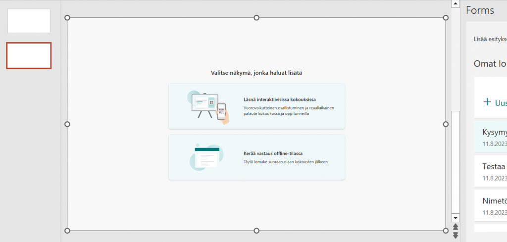 Powerpoint on yksi käytetyimpiä opetuksen digityökaluja. Nyt esitysmateriaaliohjelman käyttömahdollisuudet laajenevat entisestään, sillä Forms-lomakkeen upotus esitykseen on mahdollista. Näin esitysmateriaaliin voidaan yhdistää kuulijoita osallistavia elementtejä ja tehdä luentomaisesta opetuksesta interaktiivista jopa isojen osallistujamäärien kanssa.