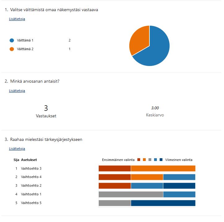 Ps.Tiesithän, että voit käyttää Formsia myös tenttien tekoon? Tässä ovat ohjeet lomakkeella suoritettavaan tenttiin ja tässä ovat ohjeet kysely-tyyliseen tenttiin. Jos et halua formaalia tenttiä tehdä, niin Forms taipuu myös taitotason selvittämiseen; tutustu tästä!