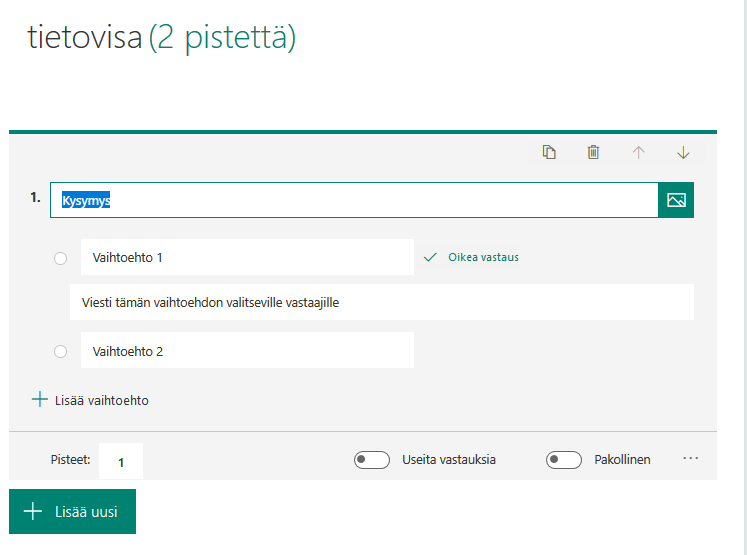 Kysymyksiä luotaessa määritellään mikä vastausvaihtoehdoista on oikein ja kuinka monta pistettä oikeasta vastauksesta saa.