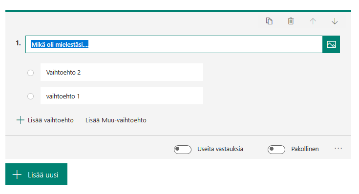 - Lomake/Form: Valitse tämä, jos haluat kerätä vastauksia, esim esseitä, tehtävien vastauksia, muu kysely, mutta sinulla ei ole tarvetta arvioida niitä Formsin kautta.