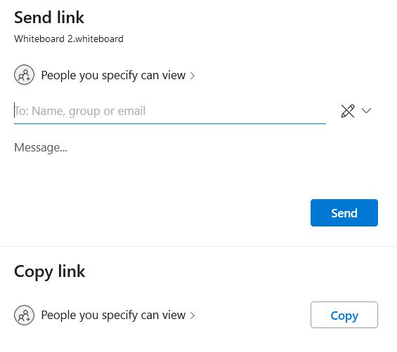 Yläreunan share-painikkeesta voit valita muokkaajat yksitellen tai ottaa talteen linkin, jonka jaat osallistujille, esim. kokoushuoneen chatissa tai lähitilanteessa olijoille. Huomioi, että Whiteboard on toistaiseksi vain oman organisaatiosi jäsenten muokattavissa. Ainoastaan Teams-kokoukseen yhdistetty Whiteboard on myös kokoukseen osallistuvien vieras-jäsenten muokattavissa.