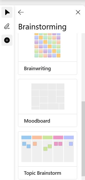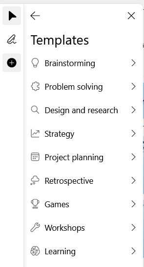Vasemman laidan +-merkin takaa saat esiin valikon josta löydät myös valmiit pohjat, Templates, ideariihi-työskentelyyn.