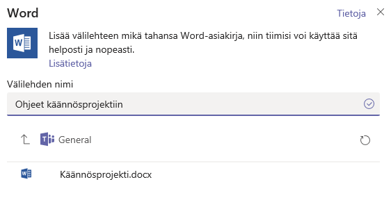 HUOM! Mikäli haluat välilehdeksi jonkin tiedoston (esim. Word-asiakirjan), käy lataamassa se ensin Teams-alueelle Files ( Tiedostot)-painikkeen kautta. Kun sitten klikkaat Lisää välilehti > Word, saat näkyviin kaikki valittavissa olevat Word-asiakirjat.