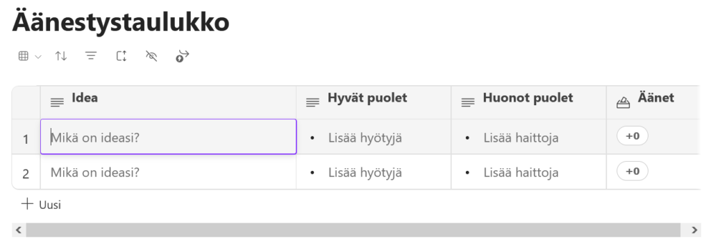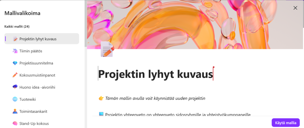 Kun luot uuden sivun, voit lähteä liikkeelle tyhjästä sivusta tai valita jonkun mallipohjan. Näet sivun alareunassa muutaman yleisimmän ehdotuksen tai valita mallipohjat-kohdasta lisää valmiita pohjia. Esimerkiksi kokousmuistiinpanot-pohjassa on valmiina yleisimmät elementit mitä kokouksista yleensä täytetään.