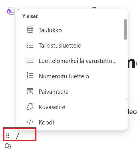 Tyhjään pohjaan tai valitsemaasi mallipohjaan voit lisätä komponentteja, eli toiminnallisia elementtejä ja tekstikenttiä, kirjoittamalla / -merkin tekstikenttään. Tämä aukaisee valikon.