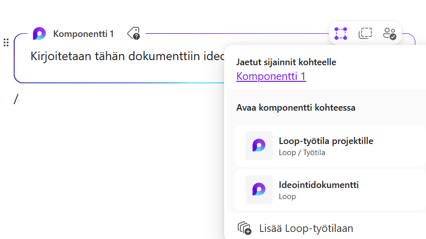 Jokaisella sivulle lisätyllä Loop-komponentilla on oma osoitteensa, joten voit poimia komponentin osoitteen ja lisätä sen esim kokouskutsuun sähköpostiviestiin jne.