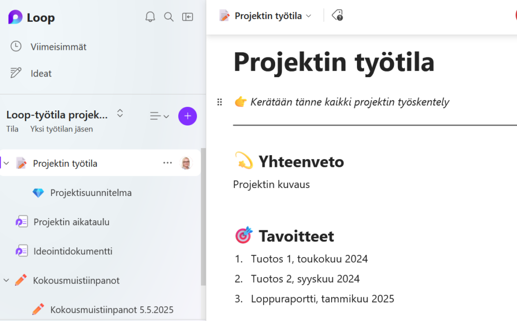 Työtilan sivuja ja yksittäisiä Loop-elementtejä voit poimia ja linkittää muihin M365:n työkaluihin, kuten Teamsiin, OneNoteen, whiteboardiin ja Outlookiin. Microsoft Loop soveltuu erityisen hyvin projekteihin, jotka vaativat tiivistä yhteistyötä ja tiedon jakamista. Se voi olla hyödyllinen esimerkiksi projektinhallinnassa, tutkimustyössä tai opetuksessa.
