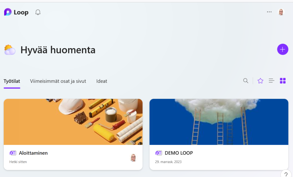 Loopin etusivulla näet luomasi tai sinulle jaetut työtilat. Oikean yläreunan + -merkistä pääset luomaan uuden tilan.