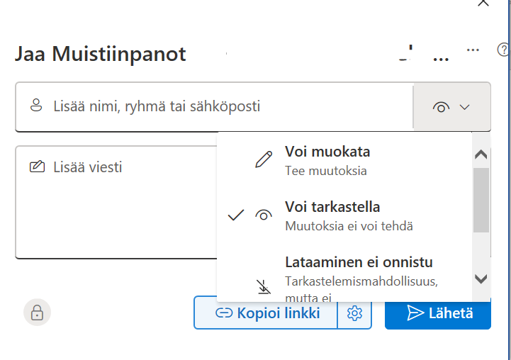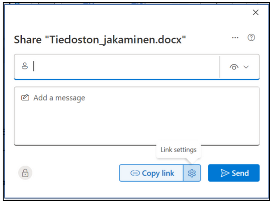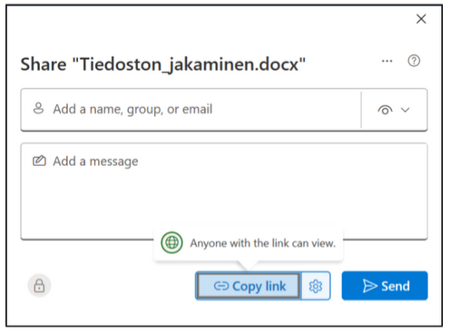 Hae nimellä tai sähköpostiosoitteella kenttään esiin henkilöt, joille haluat jakaa tiedoston. Kirjoita tarvittaessa saateviesti. Valitse lähettäjän oikealta puolelta, että haluatko, että henkilö pystyy vain katselemaan vai myös muokkaamaan tiedotoa. Voit myös estää teidoston lataamisen. Napsauta ”Send/Lähetä”, jolloin valitsemillesi käyttäjille lähtee sähköpostilla jakolinkki tiedostoon ja kirjoittamasi saateviesti lisätietona.