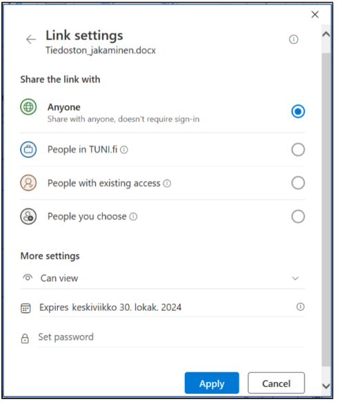 2. Valitse seuraavasta näkymästä TUNI-tunnuksella kirjautuminen, mikäli se käyttäjille on mahdollista. Kuka tahansa / Anyone -linkillä kuka tahansa linkin tietävä pääsee tiedostoon. Alenpaa valitset tarvittavat oikeudet (katselu/arviointi/muokkaus). Linkille määritetään automaattisesti saatavillaoloajan maksimi. Voit itse muuttaa sitä muokkaamalla päivämäärää.