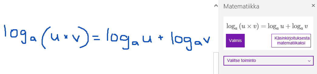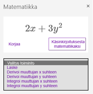 OneNote auttaa myös mm. laskemisessa, derivoinnissa ja integroinnissa. Repertuaari vaihtelee luonnollisesti yhtälöiden mukaan. Mikäli sovellus tunnistaa merkkisi väärin, saat korjattua sen oikeaksi ”Korjaa”-painikkeesta.