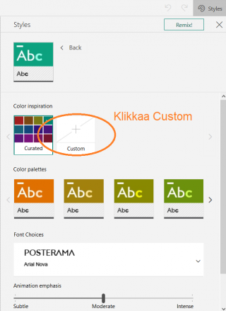 Ensimmäiseksi avaa Design -näkymä Swayssasi ja valitse avautuneen näkymän oikeasta ylänurkasta ”Styles”. Tämän jälkeen valitse avautuneesta näkymästä ”Customize”.