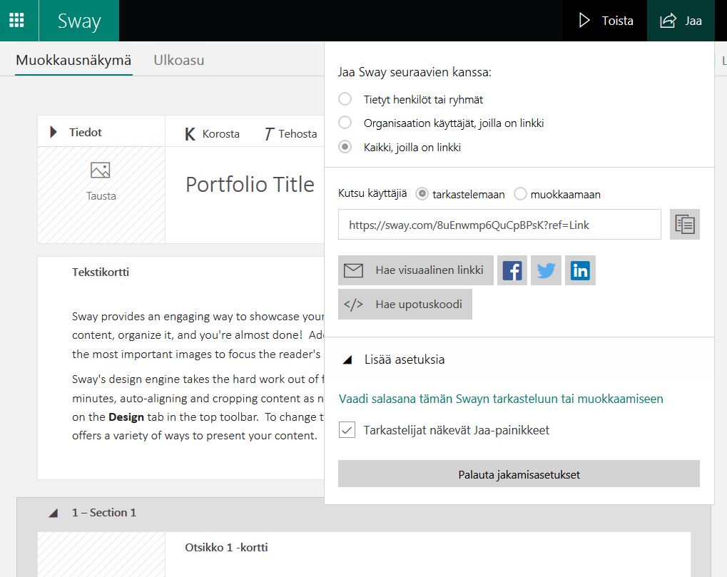 Jos pidät Swaylla esityksen, swayn voit näyttää linkin kautta (visuaalisena tai upotuskoodina) suoraan tilaisuudessa.