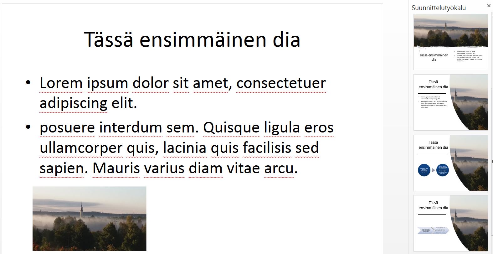 Jos valitset suunnitelutyökalun ehdottaman dian, muista muokata tekstisi fontin kokoa. Useimmiten suunnittelutyökalu nimittäin pienentää fontin (varsinkin, jos diassa on paljon tekstiä, mikä ei ole esitystilanteen kannalta ihanteellisinta.