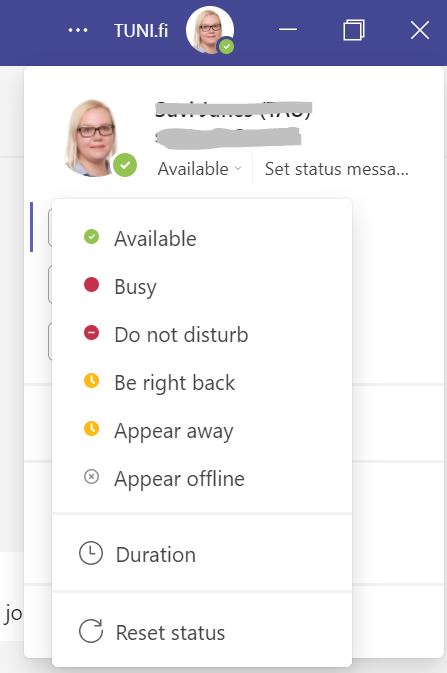 - Näy offline-tilassa / Appear offline: Tila on automaattisesti valittuna, jos et ole kirjautunut Teamsiin.