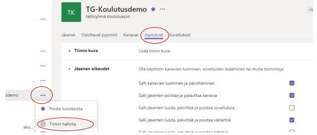 Sinun kannattaa huomioida aina, mitä oikeuksia ryhmän jäsenille annat. Oikeudet näet Asetuksista sekä kolmen pisteen kohdalta Tiimin hallinta.