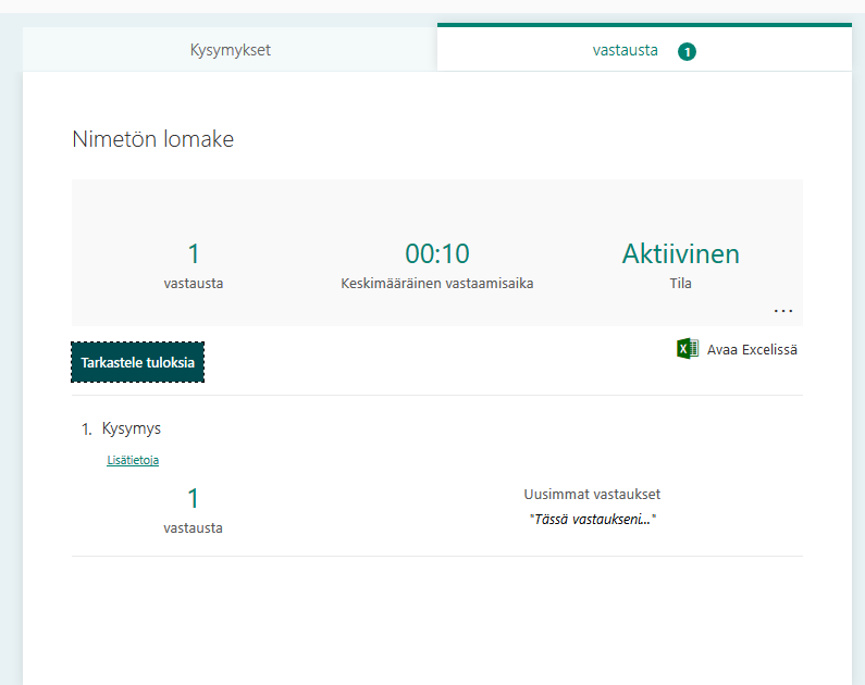 12. Vastaukset -välilehdellä voit tarkastella vastauksia joko yksitellen, kysymyskohtaisesti tai viedä vastaukset Exceliin analysoitavaksi.