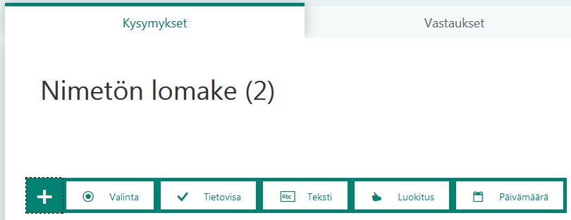 - Lomake/Forms: Valitse tämä, jos haluat kerätä vastauksia, esim esseitä tai tehtävien vastauksia, mutta sinulla ei ole tarvetta arvioida niitä Formsin kautta. Lue alla oleva vinkki.