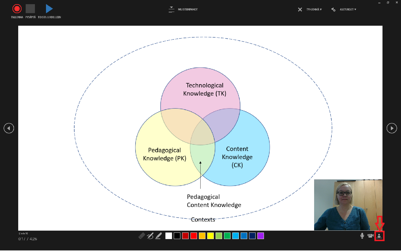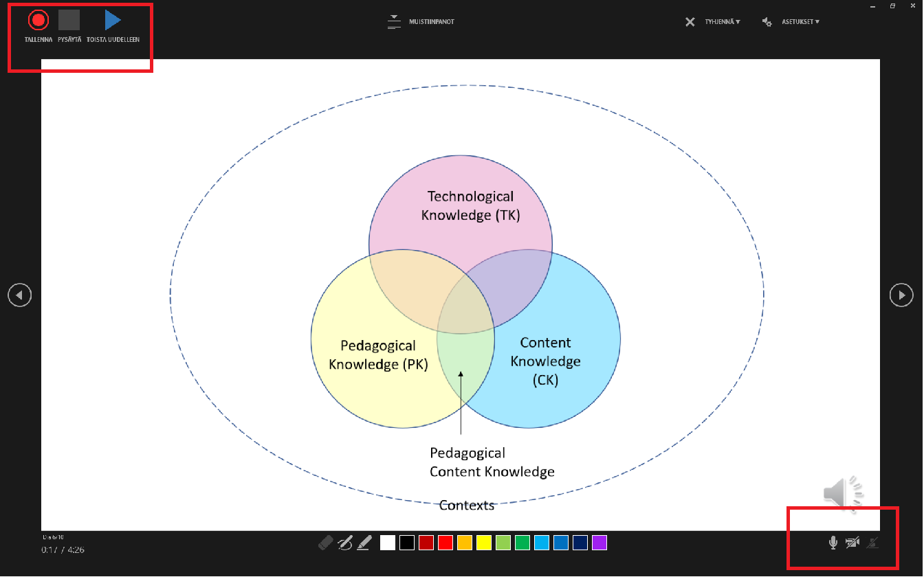 3. Kameravideo-painikkeesta voi määrittää missä kohtaa diaa kamerasi kuva näytetään. Voit myös säätää kvideokuvan muotoa ja muita asetuksia. Ääni-painikkeesta voit tallentaa pelkkää ääntä. Näyttötallenne tallentaa ruudullasi näkyvää kuvaa, esim.verkkosivua, ja hiiresi liikkeitä siinä.
