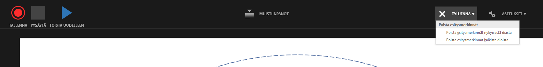 8. Voit korjata tallennetta joko koko esityksen kohdalla tai vain yhden dian kohdalta. Mene taas tallennusnäkymään ja voit tyhjentää tallenteen joko koko esityksestä tai kyseisen dian kohdalta.