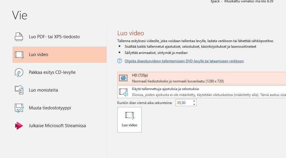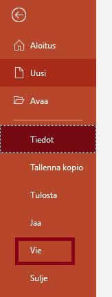 9. Kun olet valmis tallenna esitys videona. Valitse tiedosto – valikosta Vie, ja avautuvalla sivulla Luo video.