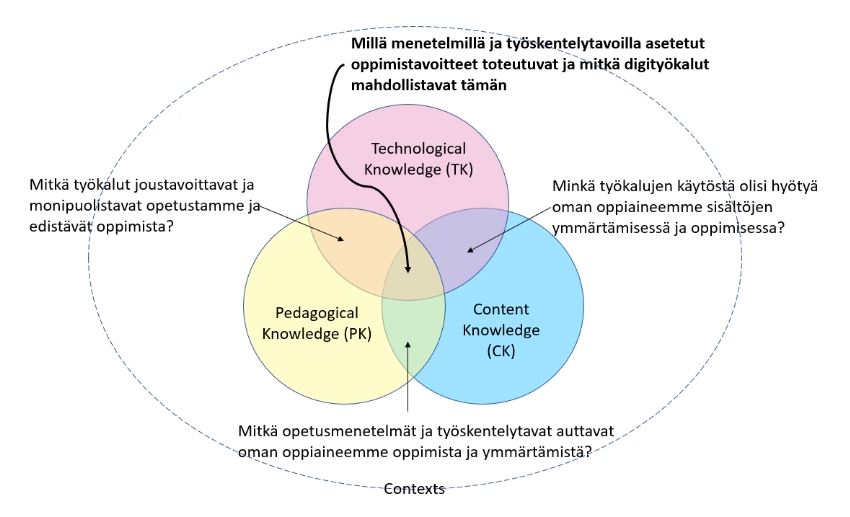 Katso oheinen video, jossa Suvi Junes tietohallinnon kehityspalveluista kuvaa digipedagogiikan osa-alueita ja oleellisia kysymyksiä TPACK-mallin kautta.