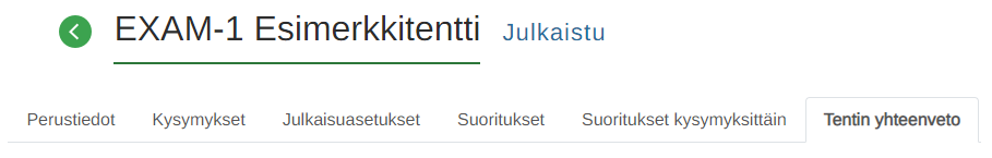 Kirjaudu EXAMiin ja valitse tentti. Valitse Tentin yhteenveto -välilehti ja näet analytiikkatietoja tentin suorituksista.