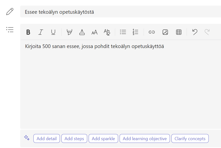 - Vaikka et käyttäisi Teamsiä opintojaksolla, voit silti hyödyntää tässä vinkissä kuvattua tapaa ideoida ja muokata tehtävänantoja. Voit kopioida tekoälyn avustaman tehtävänannon kuvauskentästä ja viedä sen vaikka Moodlen tehtävänkuvaukseksi. Teams-alueelle sinun ei tarvitse poimia ketään, vaan se voi olla tähän tarkoitukseen luomasi ja vain sinulle näkyvä tiimi.