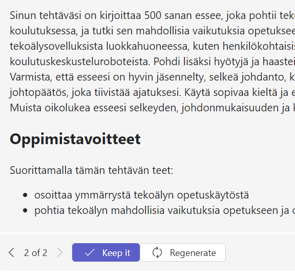 Tekoälyn ehdottaman tekstin lopusta voit valita, että haluatko pitää tekstin (Säilytä se) vai pyytää uutta tekstiä (Luo uudelleen). Voi myös poistaa ehdotuksen Cancel/poista-painikkeesta. Jos pidät tekstin, se ilmestyy kuvauskenttään ja voit itse muokata sitä edelleen. Tekoälyn ehdotus onkin usein hyvä pohja, mutta vaatii tarkistamista niin kielen kuin sisällönkin osalta. Ehdotus antaa kuitenkin ideoita tehtävän muotoiluun ja ohjeen parantamiseen.