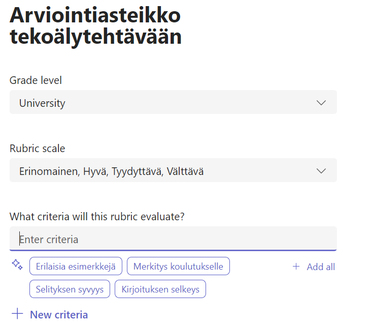 Täytä seuraavilta aukeavilta sivuilta kuinka monta kohtaa haluta arviointiasteikkoon, ja mitä asioita haluat arvioida. Tämän jälkeen tekoäly luo sinulle ehdotuksen kriteereistä.