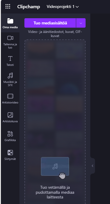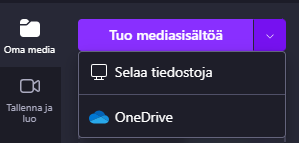 Jos haluat yhdistellä aiemmin tekemiäsi videoita, muokata ja käsitellä niitä eri tehostein valitse Oma media ja joko etsi kyseiset tiedostot koneeltasi tai raahaa ne resurssinhallinnasta suoraan palveluun.
