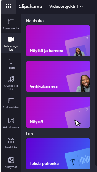 Vasemman sivun painikkeista voit valita, että haluatko lähteä tallentamaan uutta videota tai näyttökuvaa (tallenna ja luo), vai käsitellä ja editoida aiemmin tekemiäsi videoita (tuo mediasisältöä).