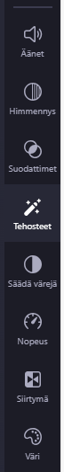Oikeasta reunasta löydät erilaisia tehosteita ja suodattimia, joilla voit esimerkiksi säätää videon nopeutta tai häivyttää puhujan taustan.