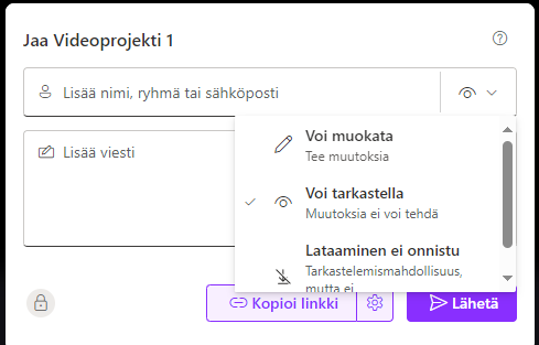 Voit jakaa muokkaus- tai katseluoikeuden videoosi tietyille henkilöille tai poimia linkin, jonka kautta haluamasi joukko pääsee videota katselemaan.