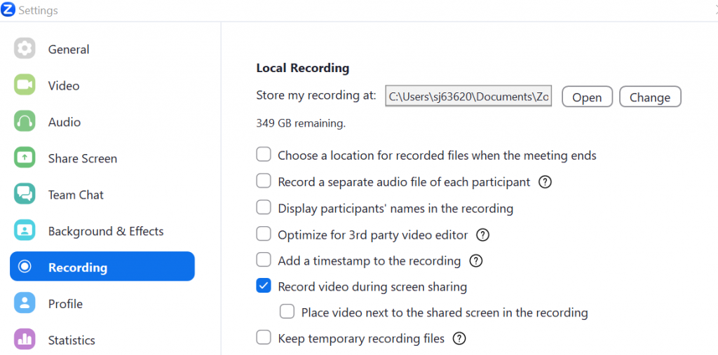 Tarkista Recording-välilehdeltä, että ”Display participants’ names in the recording” on pois päältä.