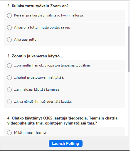 Mikäli olet huolissasi siitä, mitä reaktioita videokuvan käyttäminen herättää, selvitä osallistujien ajatuksia esimerkiksi anonyymillä Zoomin polling tai Forms -kyselyllä.