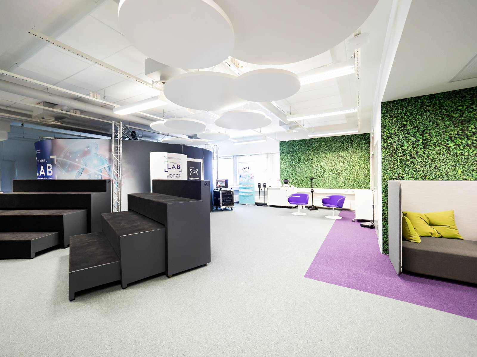 Moderni ja raikasilmeinen labimme muuntuu moneen tarkoitukseen. Labissa on kolme erillistä tilaa: ns. sylinteritila, tutkimushuone ja neuvottelutila, jossa on myös showroom-esittelytilaa yrityksille.